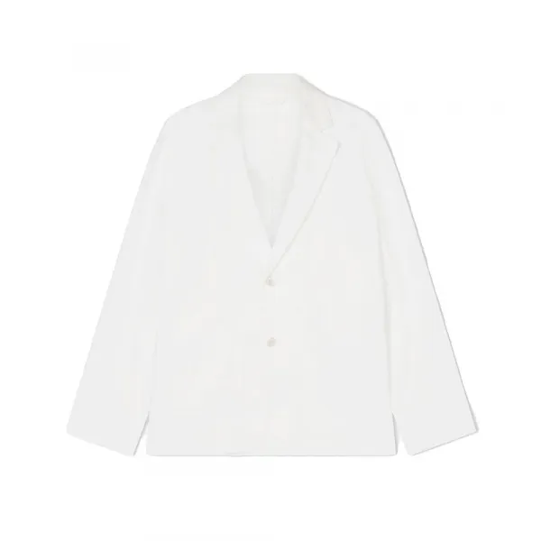 거울 칼라와 더블 버튼 클로저가 특징인 완전 언컨스트럭티드 및 비접지형 블레이저입니다.