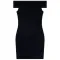 정기 길이의 오프숄더 바디콘 스타일로, 왼쪽 옆면에 지퍼와 뒷면에 로고 장식이 있습니다.