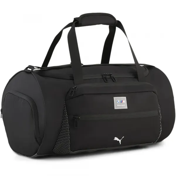 (BM: 재활용 함량 (50%)) 깔끔하고 역동적인 디자인의 배럴 백 메인 수납공간으로 이어지는 양방향 지퍼 개폐 지퍼 측면 포켓 반대편 외부 신발 수납공간 전면 지퍼 포켓 메인 수납공간 하단 내부 지퍼 메쉬 포켓 벨크로 잠금 장치가 있는 상단 손잡이 두 개 (앞면 및 뒷면) 플라스틱 하드웨어가 있는 조절 가능한 숄더 스트랩 점선 프린트 디테일, BMW 색상 직조 루프.