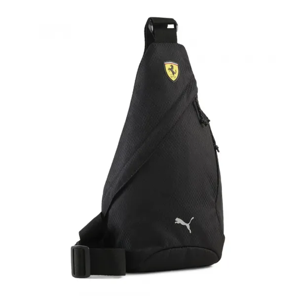 (bM: 재활용 함량 (90%)) 모던 슬링백 세련된 디자인 지퍼형 메인 수납공간 외부 지퍼 포켓 에어메쉬 등판 플라스틱 하드웨어 조절 가능한 웨빙 숄더 스트랩 조절 가능한 숄더 스트랩 전면 프리미엄 TPU 페라리 쉴드 로고 배지 HD 프린트 푸마 캣 로고 우븐.