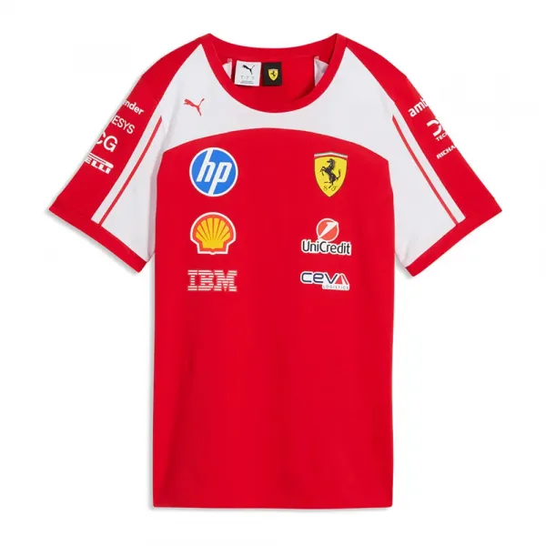 흰색과 빨간색 컬러를 특징으로 하는 이 티셔츠는 현대적인 퍼포먼스 렌즈를 통해 스쿠데리아 페라리의 헤리티지를 담고 있습니다.