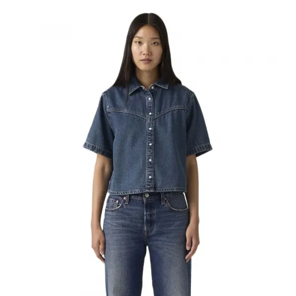 저희 로건 반팔 데님 셔츠는 클래식한 버튼 업 디자인, 요크 디테일, 살짝 크롭된 핏이 특징입니다.