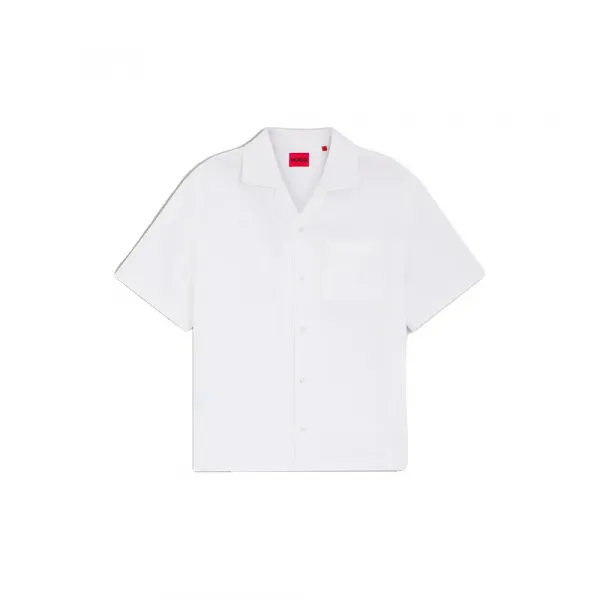 특징: - 기장: 짧은 기장 - 핏: 오버사이즈 핏 - 칼라: 캠프 칼라 - 소매 길이: 반팔 - 가슴 포켓: 앞가슴 포켓 사양: - 소재: 100% 면, 포켓 안감: 35% 면, 65% 폴리에스터