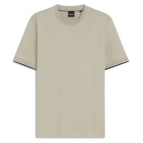 짧은 소매 커프스는 상징적인 BOSS 컬러 팔레트인 블랙, 화이트, 카멜 색상의 섬세하게 구조화된 스트라이프로 장식되어 있습니다.