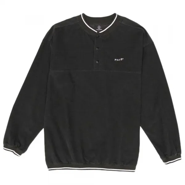 특징: - 남성용 롱 슬리브 코듀로이 스웨트셔츠 - 립 칼라 - 박시핏 - 노벨티 얀 다이 립 디테일 - 왼쪽 가슴에 볼컴 타이포 자수 - 프런트 요크가 있는 헨리 플래킷 - 앞면에 커스텀 로고 버튼 3개 줄