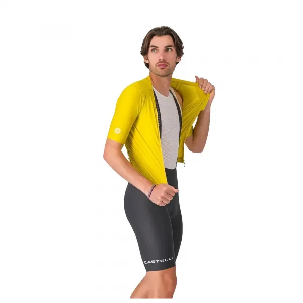편안함과 완벽한 착용감을 위한 Castelli 엔지니어링 에스프레소 도피오 패브릭 하루 종일 편안함을 위한 Progetto X2 Air 심리스 빕 패드 실리콘 그립이 있는 생분해성 다리 끝단 통풍과 편안함을 위한 신축 메쉬 빕 스트랩 추가 수납 공간을 위한 후면 포켓.