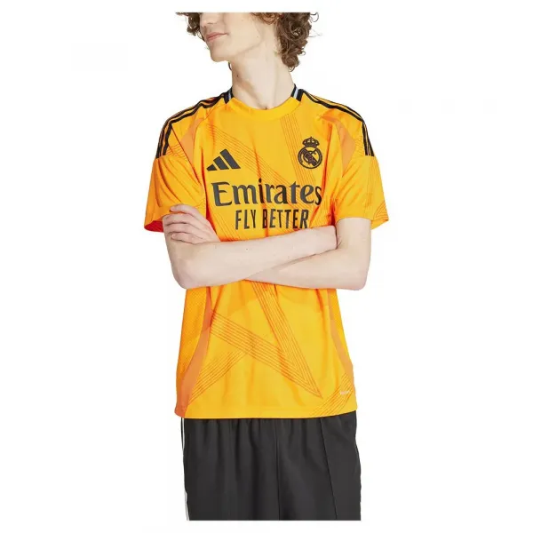 레알 마드리드의 눈부신 기술을 보완하기 위해 제작된 이 아디다스 원정 유니폼은 생동감 넘치는 오렌지색 바탕에 추상적인 별 모양 디자인이 돋보입니다.
