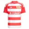 FC 우니온 베를린 홈 저지는 가로 방향의 빨간색과 흰색 줄무늬가 돋보입니다.