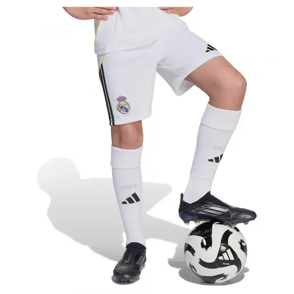 베르나베우 경기장의 최신 개조를 기념하는 레알 마드리드 홈 키트의 일부인 이 주니어용 아디다스 축구 반바지는 밑단 위의 자수 처리된 팀 배지로 당신의 지지를 보여줍니다.