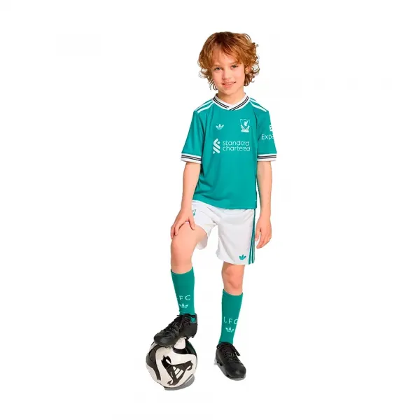 헤리티지 아디다스 스타일로 제작된 축소된 리버풀 FC 써드 키트입니다.