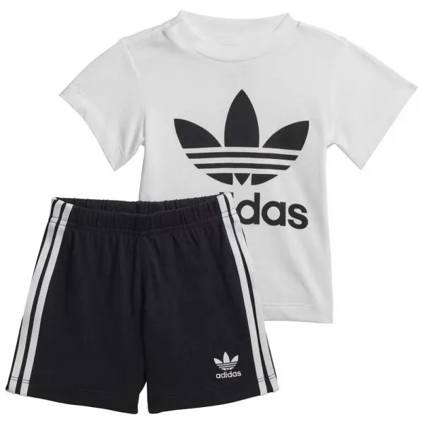 이 유아용 2 피스 세트에는 큰 Trefoil 로고가 깜박이는 클래식 한 3 줄 줄무늬가있는 셔츠가 함께 제공됩니다.