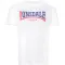 가슴 부분의 투톤 로고 레터링과 어깨 부분의 색상 대비 장식 솔기가 있는 티셔츠.