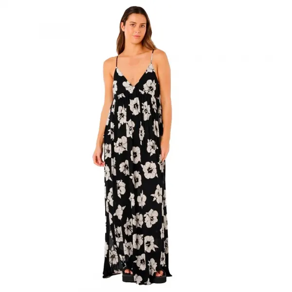 길고 유려한 파티 팩 맥시 드레스는 전체 야드 프린트와 버튼 스루 스타일링이 조화를 이루며, 편안한 서핑 데이를 위해 유연제 워싱으로 마감되었습니다.